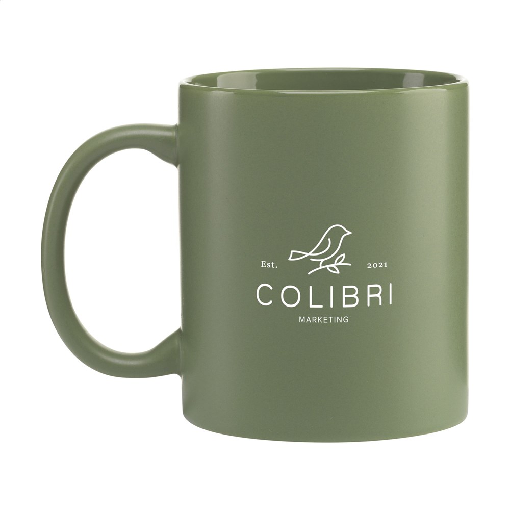 Becher aus hochwertiger Keramik mit mattierter Außenseite und glänzender Innenseite. Spülmaschinengeeignet. Der Aufdruck ist spülmaschinengeprüft und nach EN 12875-2 zertifiziert. Fassungsvermögen 350 ml.