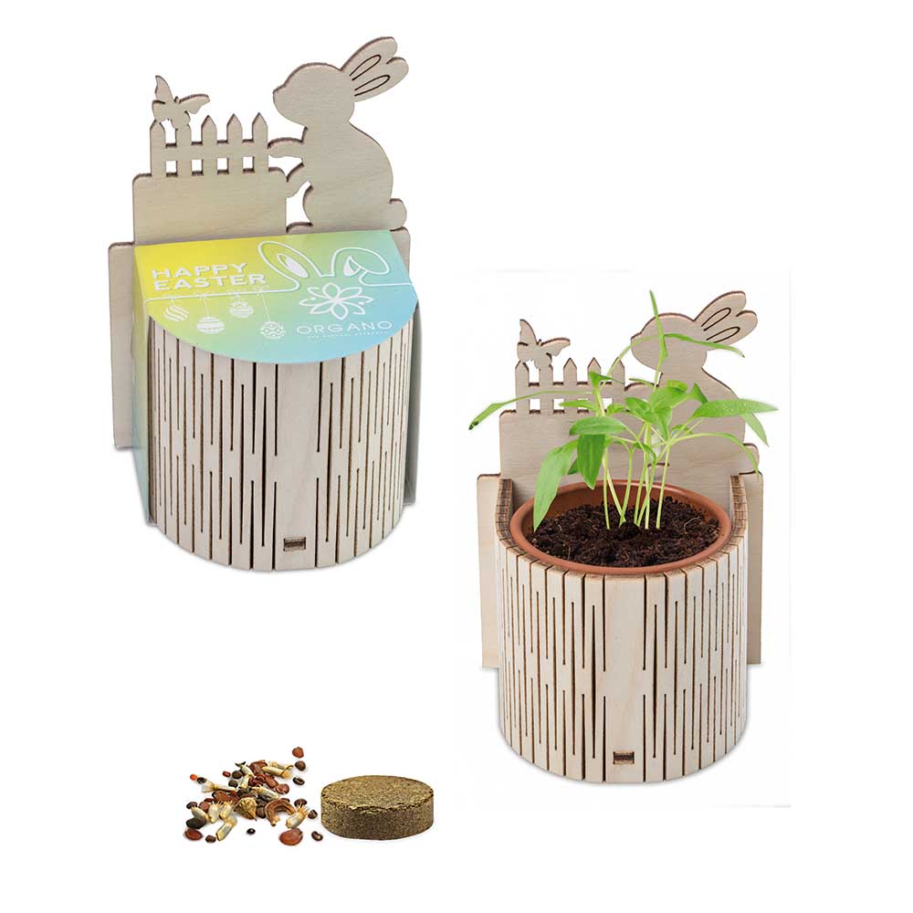 Der liebevoll gestaltete Tiny Garden ist ein natürlich schönes Oster-Highlight. Das kleine Tontöpfchen ist von einem filigranen Holzzäunchen eingefasst und wird durch eine Rückwand aus Holz mit zarter Hasenkontur ergänzt – ideal für eine gelaserte Werbebotschaft oder ein Logo. Gefüllt mit einer Substrattablette als Erde und Eierbaumsamen entsteht daraus ein charmantes Mini-Gartenprojekt. Die individuell bedruckte Banderole aus Papier verschließt das Set und rundet das Produkt harmonisch ab – ein sympathisches Giveaway, das Natürlichkeit und Werbewirkung perfekt verbindet.