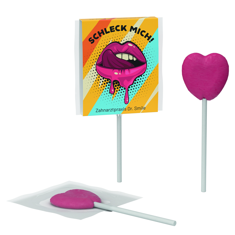 Flacher Lolly in Herzform in einer Werbeverpackung aus Karton, Verpackung individuell bedruckt. Inhalt: 1 Lolly in Herzform, Kischgeschmack, 10 g