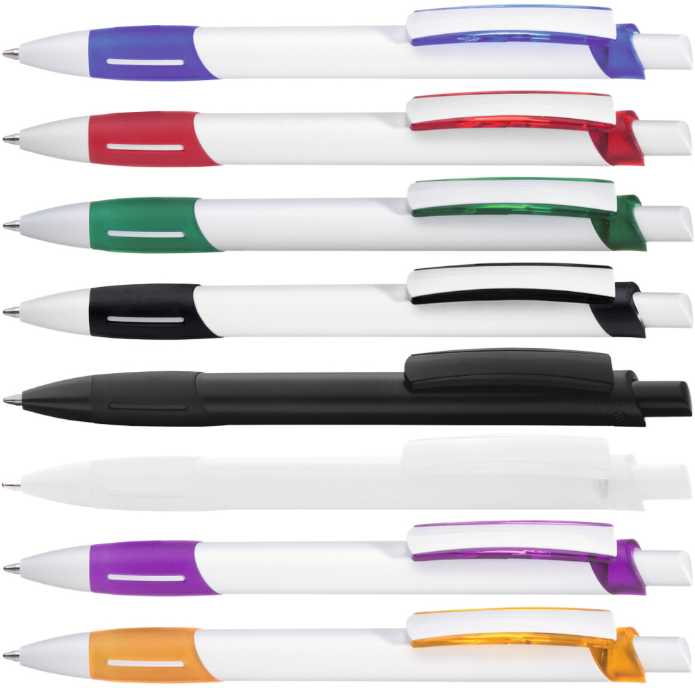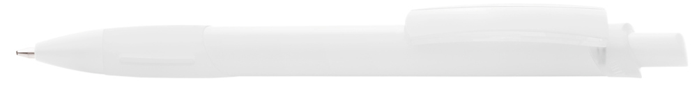 Druckkugelschreiber mit gedeckt weißem Gehäuse, transparent gefrosteter Gummigriffzone, Zierring und Clipschale.