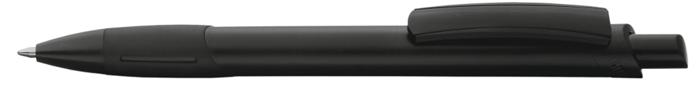 Druckkugelschreiber mit gedeckt weißem Gehäuse, transparent gefrosteter Gummigriffzone, Zierring und Clipschale.
