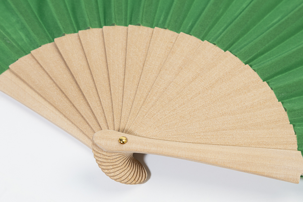Handfächer aus RPET-Polyester mit Holzspeichen.