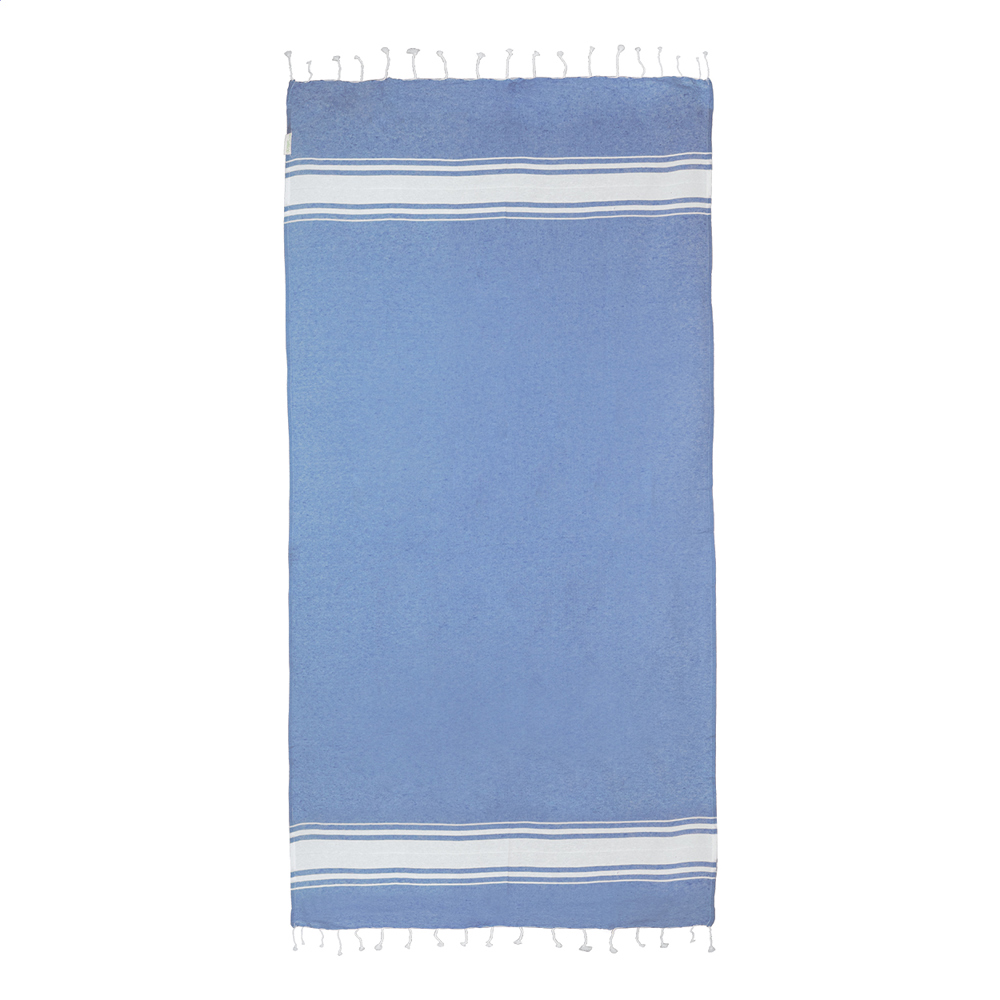 Zweifarbiges Pareo-Strandtuch. Material: 70 % recycelter Baumwolle und 30 % RPET-Polyester (180 g/m²).