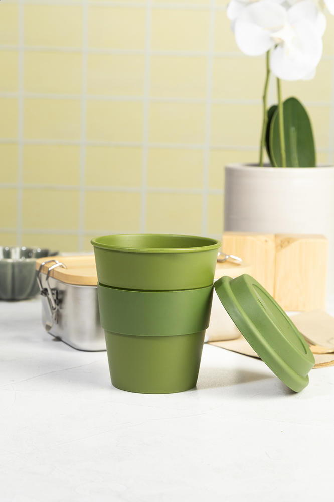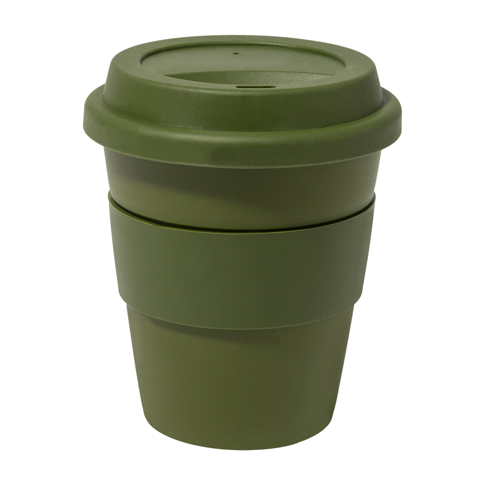 Einwandiger Reisebecher aus PP mit Trinkdeckel und Ring aus TPE. Füllmenge: 350 ml.