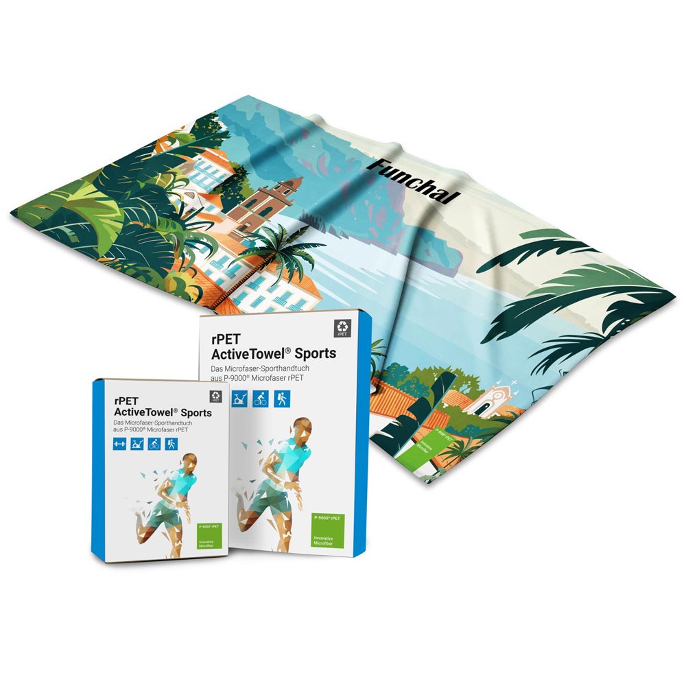Das rPET ActiveTowel® Sports ist der perfekte Begleiter für Training, Reisen und Alltag. Hergestellt aus hochwertiger P-9000® Microfaser rPET, die aus recyceltem PET gewonnen wird, verbindet es eine angenehm weiche Haptik mit moderner Materialtechnologie. Durch seine kompakten Maße lässt sich das Sporthandtuch mühelos verstauen, während der vollflächige Druck in Fotoqualität Raum für individuelle Designs und eine wirkungsvolle Markenpräsentation bietet. Geliefert wir das Sporthandtuch in einer voll recyclingfähigen Faltschachtel mit bedruckbarem Schuber. Entdecken Sie jetzt die perfekte Kombination aus praktischem Sporthandtuch und einer zusätzlichen Werbefläche auf der Umverpackung.