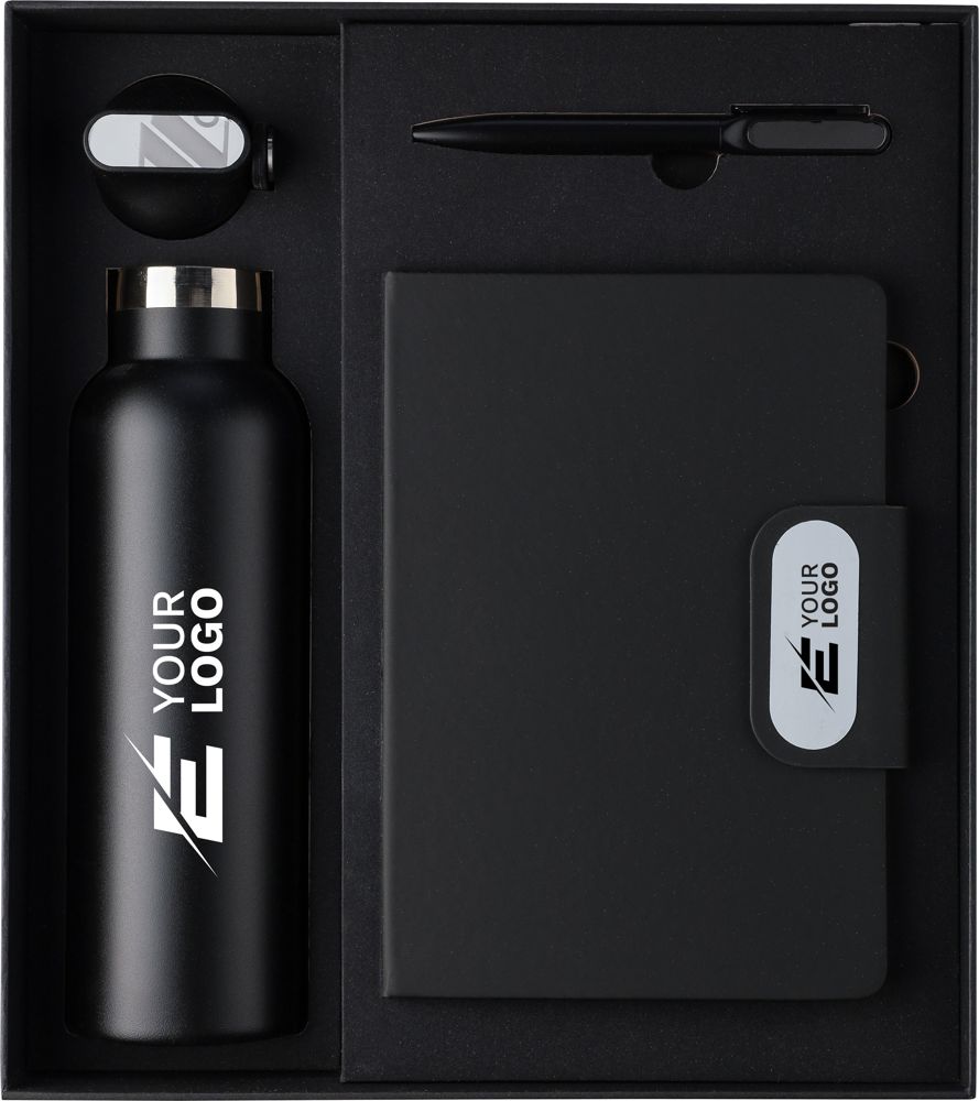 Dieses Geschenkset aus Karton besteht aus einer doppelwandigen Trinkflasche aus recyceltem Edelstahl (304) mit Silikongriff, einem Drehkugelschreiber aus recyceltem Aluminium mit blauer Tinte sowie einem Notizbuch aus recyceltem PU mit 80 Blatt 70 g/m² liniertem FSC-Papier. Das Notizbuch verfügt über ein Lesezeichen mit Band sowie einen magnetischen Metallverschluss mit Gravurplatte aus Rotguss. Alle Artikel sind mit einem recycelten Logo versehen: Es ist auf der Flasche und dem Kugelschreiber eingraviert und auf dem Notizbuch geprägt.