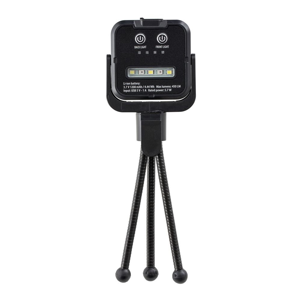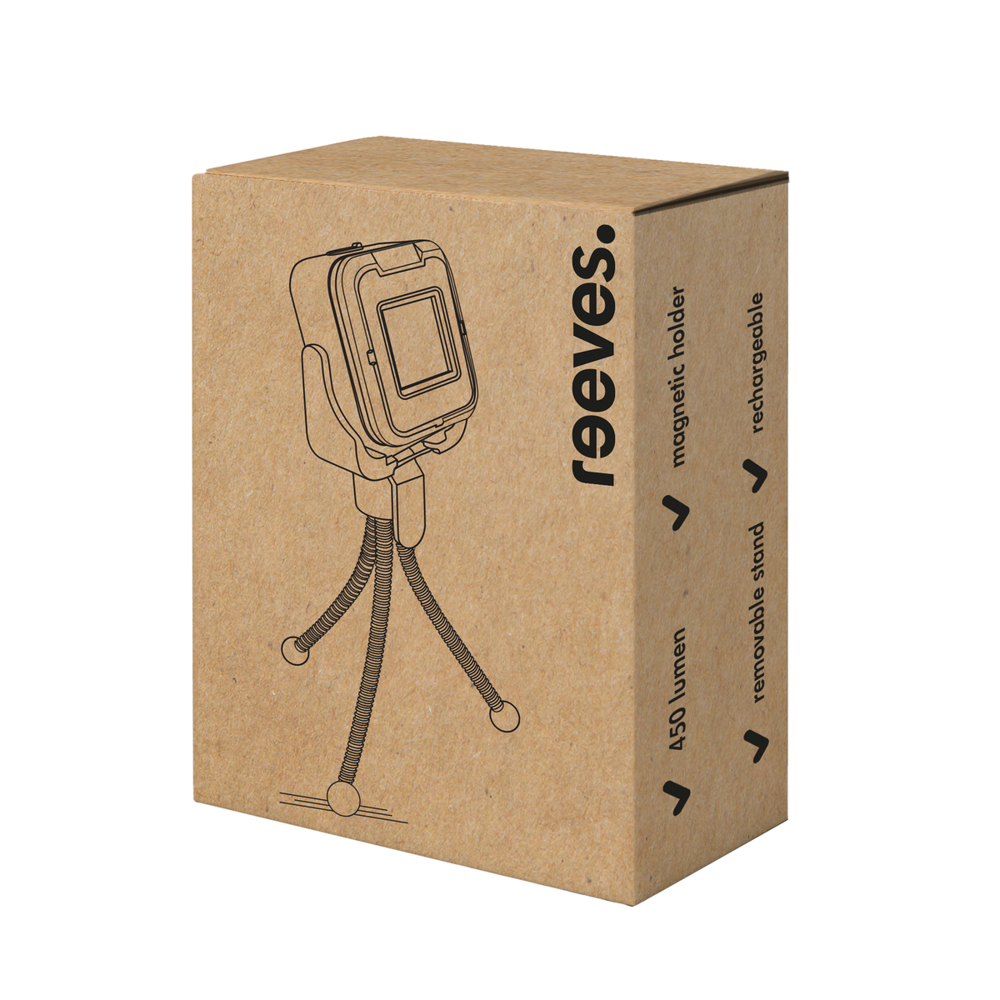 Die wiederaufladbare, magnetische Arbeitsleuchte REEVES-Strogan ist beidseitig mit jeweils einer LED-Leuchte ausgestattet und steht sicher auf einem abschraubbaren Standfuß in Form eines flexiblen Tripod.