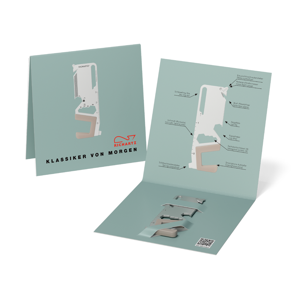 Das RICHARTZ® KEY TOOL mobile ist der erfolgreiche Werbeträger für Marken und Unternehmen. Mit einer individuellen Lasergravur und individuell gestalteter 4-seitigen Verpackung in 4c, werben Marken aufmerksamkeitsstark und aussagekräftig!
