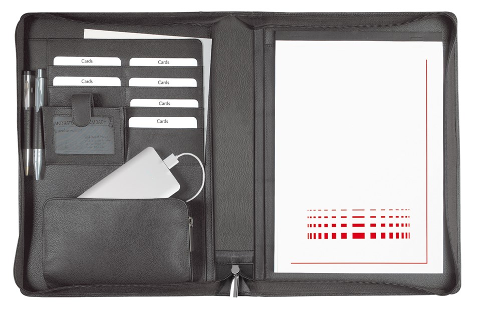 Reißverschlussfach für Utensilien, Karten- und Steckfächer, Stiftschlaufen, inkl. Block