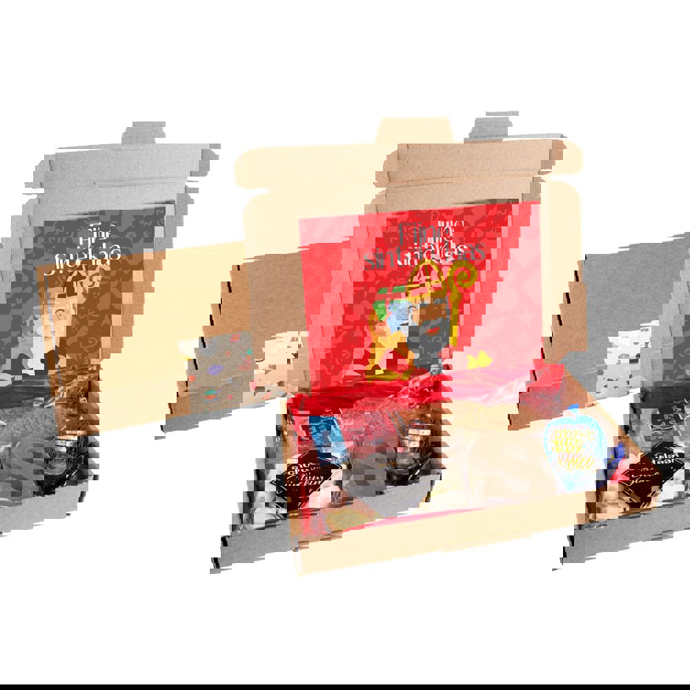 Braune Versandschachtel A5, gefüllt mit einem Spekulatius-Pop, einem Schokoladenbuchstabe, einer Beutel "Schuimpjes" und Schokoladenmünzen. Mit einer doppelseitig bedruckten A5-Karte und geschlossen mit einem Standard "Sinterklaas" Aufkleber.