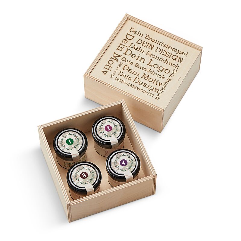 Ab 50 Stück mit Ihrem Branddruck auf dem Deckel der Birkenholzbox: Aromatisches Lebkuchengewürz für die häusliche Backstube, würziger Chai Tee, eine fein abgestimmte Glühweingewürzmischung oder eine süße Belohnung aus Haselnusskernen und Zimt-Vollmilchschokolade bringen den Weihnachtsmarkt von draußen direkt zu uns nach Hause. Verschenken Sie Weihnachten als Adventskalender mit vier Gourmetgewürzen zum Adventssonntag.