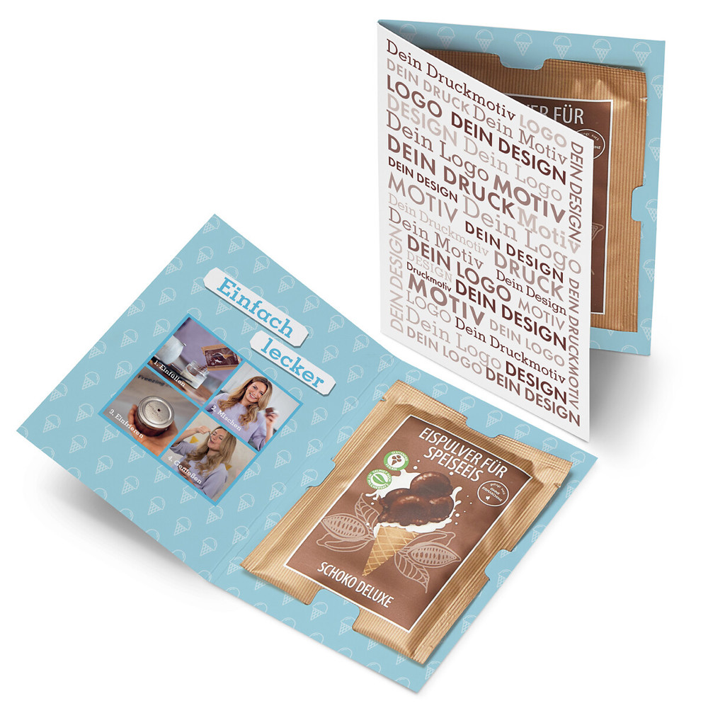 Ab 500 Stück mit Ihrem Design vollflächig auf der Klappkarte: In einer individuellen Klappkarte eignet sich das Eispulver hervorragend als kleine Aufmerksamkeit für Ihre Kunden und Mitarbeiter. Denn der perfekte Mailingartikel für den Sommer darf nur im Mund schmelzen - nicht beim Versand! Wählen Sie aus den Sorten "Schoko Deluxe" und "Vanille Royal". Dieser Artikel ist vegan, laktosefrei und glutenfrei und kann auch mit Milchersatzprodukten zubereitet werden.