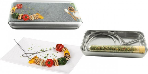 Edel und nachhaltig sind sowohl die Dose als auch unser Edelstahl-Grilldraht. Sie sind wiederverwendbar und auch optisch ein Blickfang. Zum Marinieren der Grillstücke werden Grillkräuter mitgeliefert. Die Banderole bietet viel Platz für Ihre Werbebotschaft oder, ebenfalls ab 100 Stück, für Ihre individuelle Gestaltung.