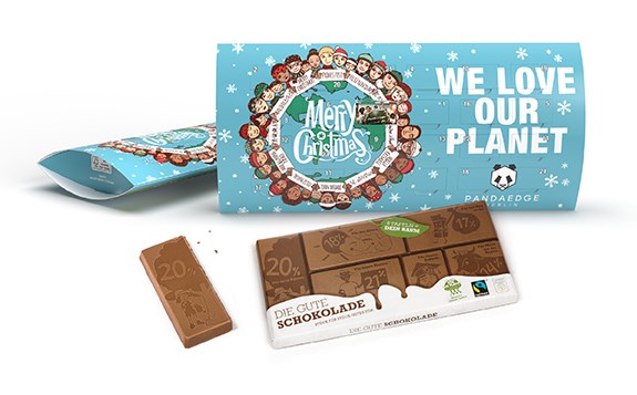 Stück für Stück Gutes tun: Der Gute Adventskalender enthält eine Tafel Fairtrade-Schokolade von Plant-for-the-Planet – verpackt in einer individuell gestaltbaren Kissenverpackung mit 24 Türchen aus FSC-zertifiziertem Karton. Fair, lecker, sinnstiftend.