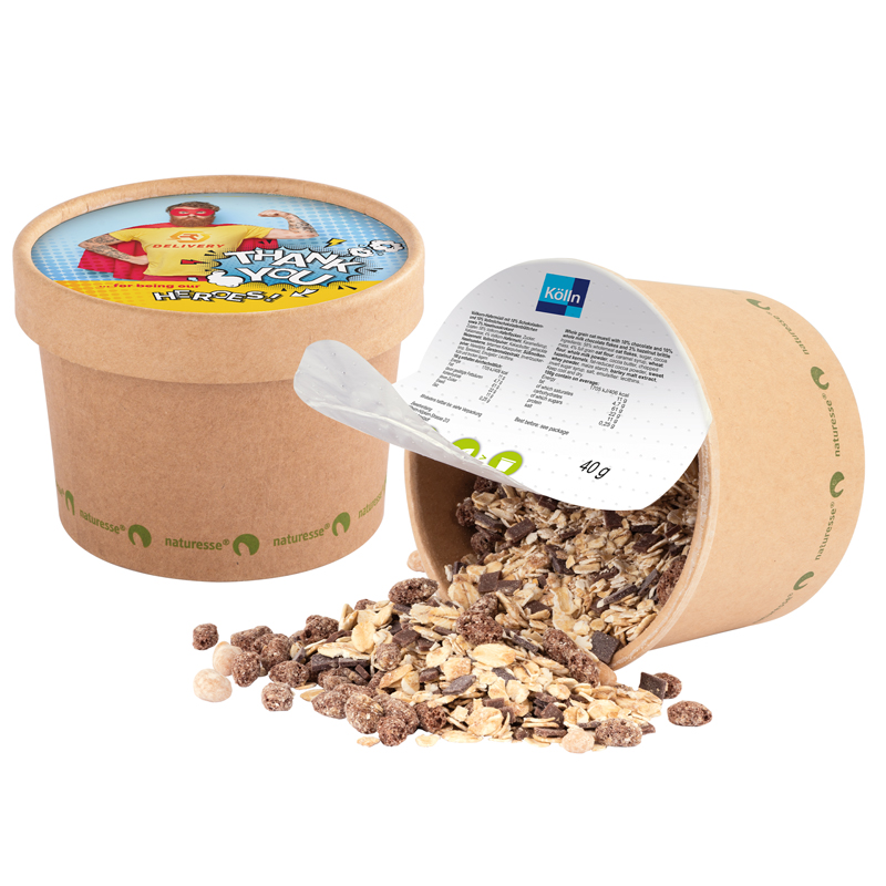 Müsli im Becher aus Karton, Werbeeinleger aus Papier individuell bedruckt. Inhalt: Kölln Schoko Hafer-Müsli (kann mit Milch im Becher zubereitet werden), 40 g