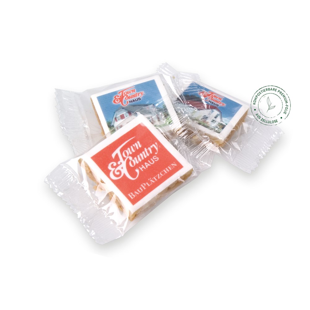 Genau richtig für Messen, Produktshows oder Events und auch als Beilage zu Produktsendungen sehr beliebt. Feine, mit Lebensmittelfarben individuell bedruckte M-Plätzchen, einzeln verpackt in Klarsichtfolie. Innerhalb einer Produktionseinheit können bis zu vier unterschiedliche Motive ohne Aufpreis