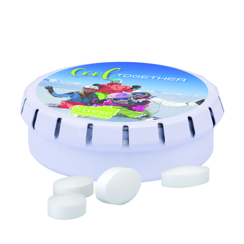Runde Dose mit Springdeckel, weiß, aus Metall, individuell bedruckt. Mit Originalitätsverschluss und Aufreißperforation, Weißblech 98% recycelbar. Inhalt: Pfeffi zuckerfreie Pfefferminzpastillen, 17 g