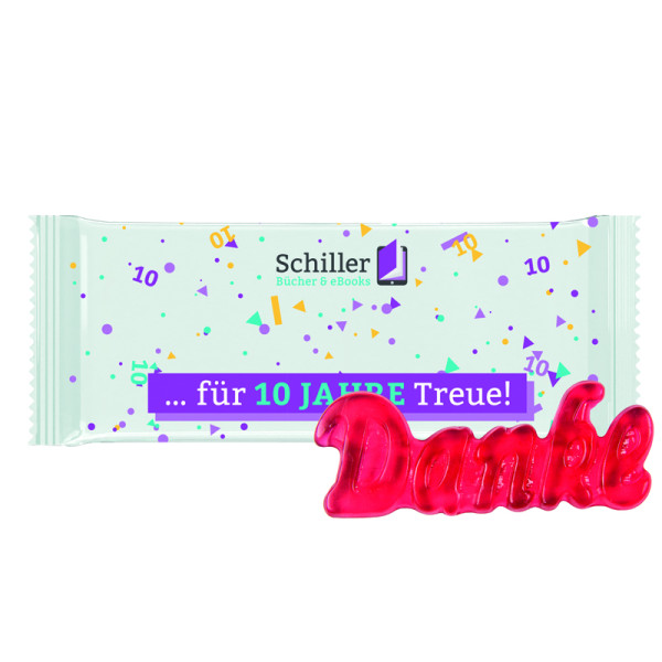 Flowpack aus weißer Folie, individuell bedruckt. Inhalt: 1 Trolli Fruchtgummi "Danke" rot, Erdbeergeschmack, in Premiumqualität mit 10 % Fruchtsaftanteil, Sonderfarben und -geschmacksrichtungen ab 50.000 Stück auf Anfrage, 12 g