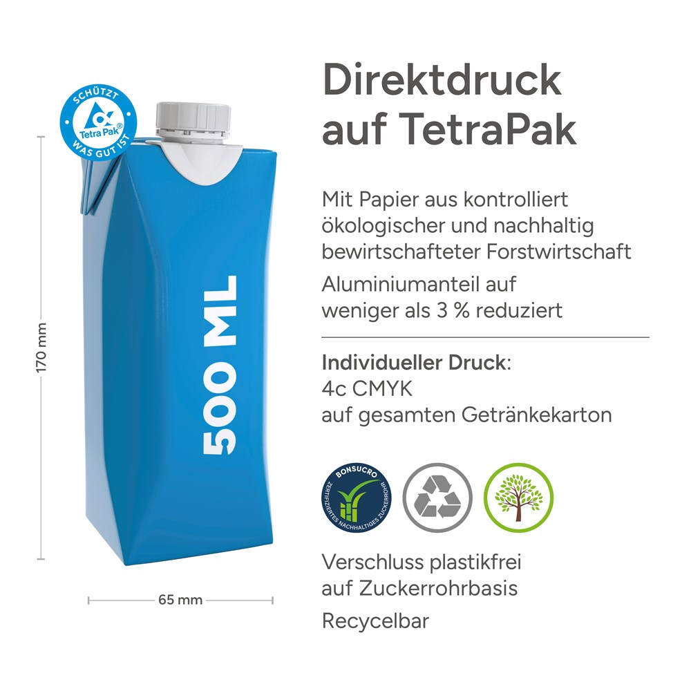 Stilles Tafelwasser im Tetra Pak "Tetra Edge" mit Schraubverschluss auf Basis von Zuckerrohr. •... mehr