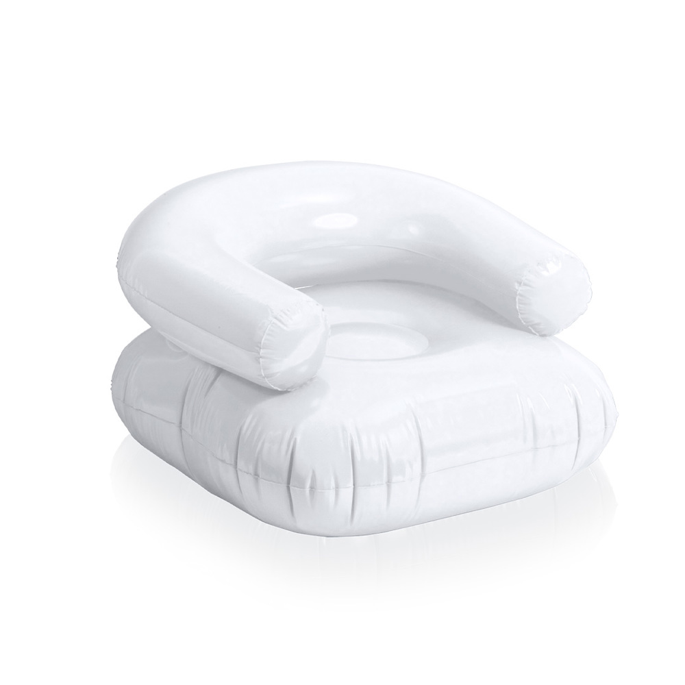 Aufblasbarer Sessel aus PVC mit bequemer Rückenlehne und verstärkter Sitzfläche in kräftigen Farben. Präsentiert mit spezieller Faltung für einfaches Bedrucken.