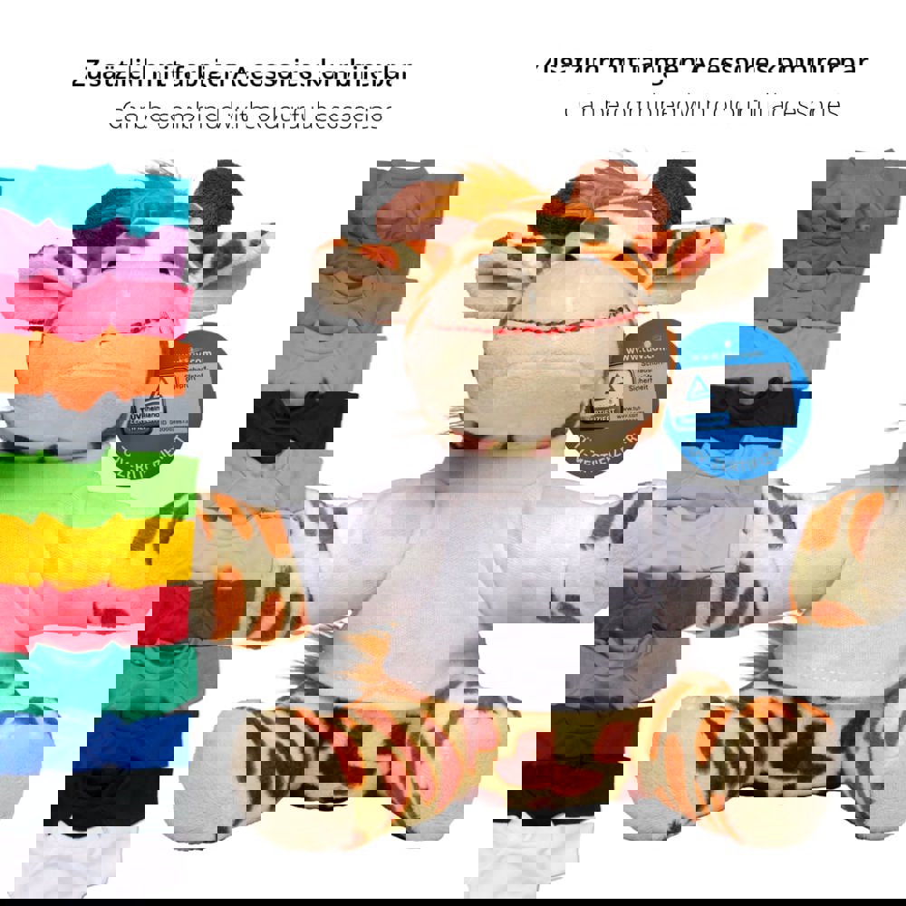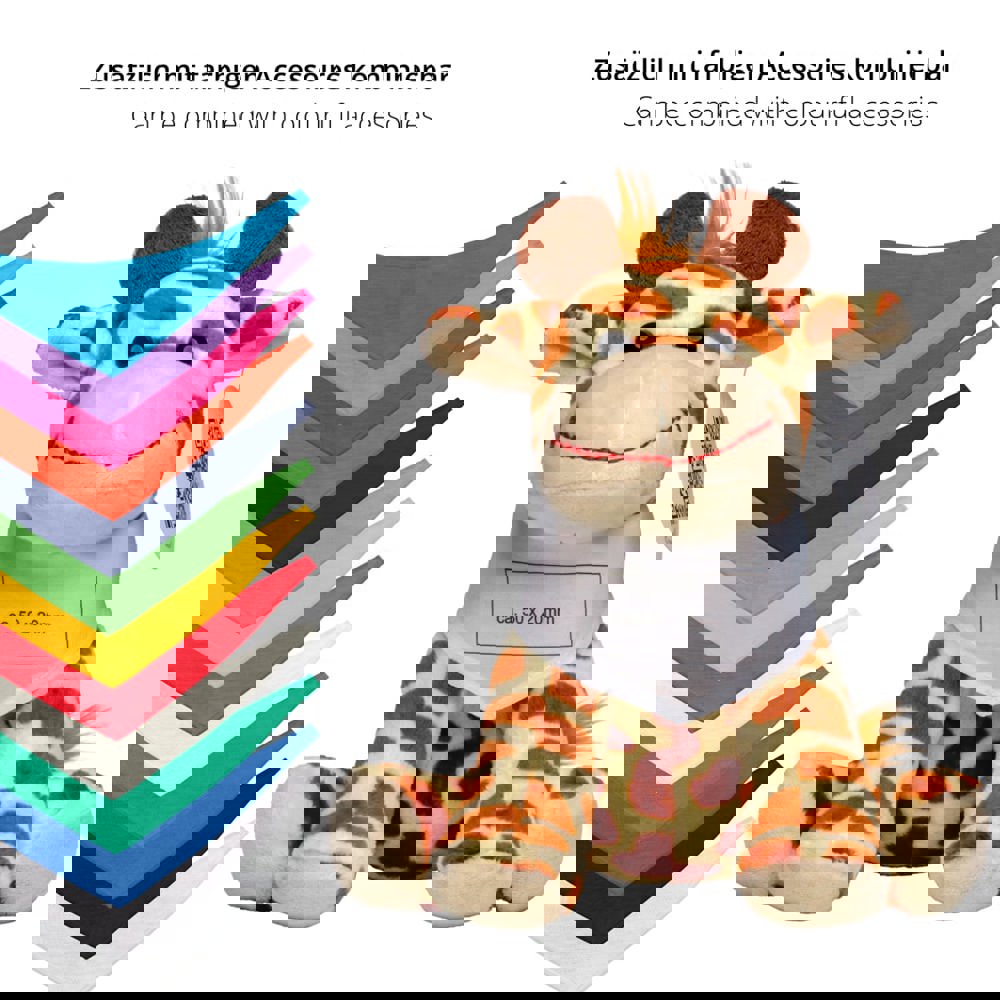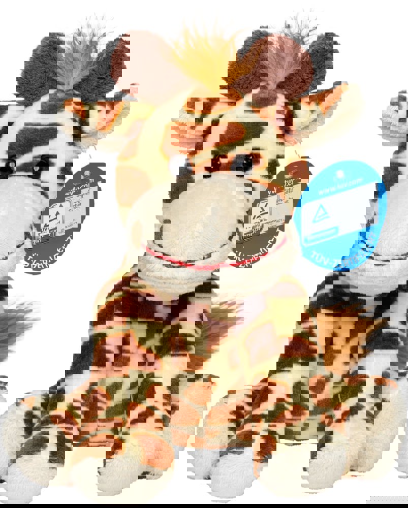 Unsere Zootier-Serie hat sich zu einem Bestseller innerhalb der MiniFeet® Familie entwickelt. Aus diesem Grund wurde die Zootier-Familie vom TÜV Rheinland auf Herz und Nieren geprüft. Nun dürfen wir voller Stolz mitteilen, dass die wilden Kuschelkumpel den Toy Proof Kriterienkatalog für Spielzeuge erfüllen. Die großen Kulleraugen und der schmuseweiche Plüsch laden zu gemütlichen Kuschelzeiten ein. Die Werbeanbringung erfolgt auf den passenden Accessoires wie Dreieckstuch oder Doming. Unsere kleine Giraffe Gabi liebt es zu schmusen. Ihr helles Fell mit den dunklen, giraffentypischen Flecken, lädt aber auch sehr dazu ein. Sitzend und breit lächelnd mit den typischen Höckern auf ihrem Kopf, sorgt sie für kuscheliges Safari-Feeling.