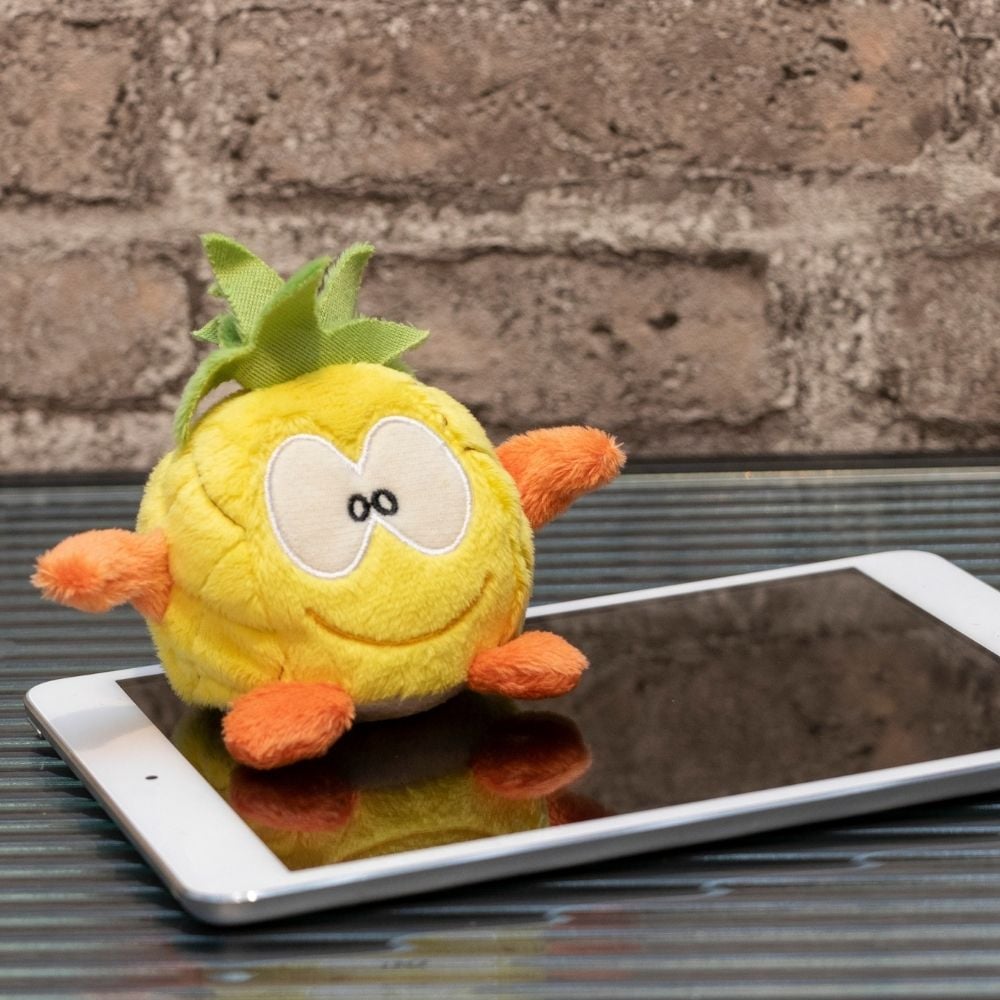 Mit ihren 7 cm Durchmesser liegen die kleinen, weichen Schmoozies® aus unserer Minifeet® Serie perfekt in der Hand. Doch die plüschigen Kuscheltiere können noch mehr als nur niedlich aus der Wäsche gucken: Mit einer Unterseite aus Mikrofaser eignen sie sich perfekt zur Reinigung glatter Oberflächen, wie z.B. Handydisplays oder Bildschirmen und zum Kuscheln und Schmusen sind sie auch perfekt geeignet. Die Werbeanbringung erfolgt auf einem Fähnchen, das an der Produktunterseite befestigt ist. Schmoozies® Ananas, das weiche Kugeltier mit einer Unterseite aus Mikrofaser ist vielseitig einsetzbar.