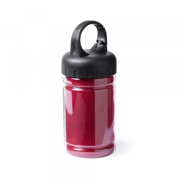 Handtuch mit den Maßen 90 x 30 cm aus kühlendem SoftCool-Extreme-Material (160 g/m2) mit UV-50-Schutz. Präsentiert in einem transparenten Gehäuse mit Deckel und Tragegriff sowie integrierten Befestigungskarabiner.