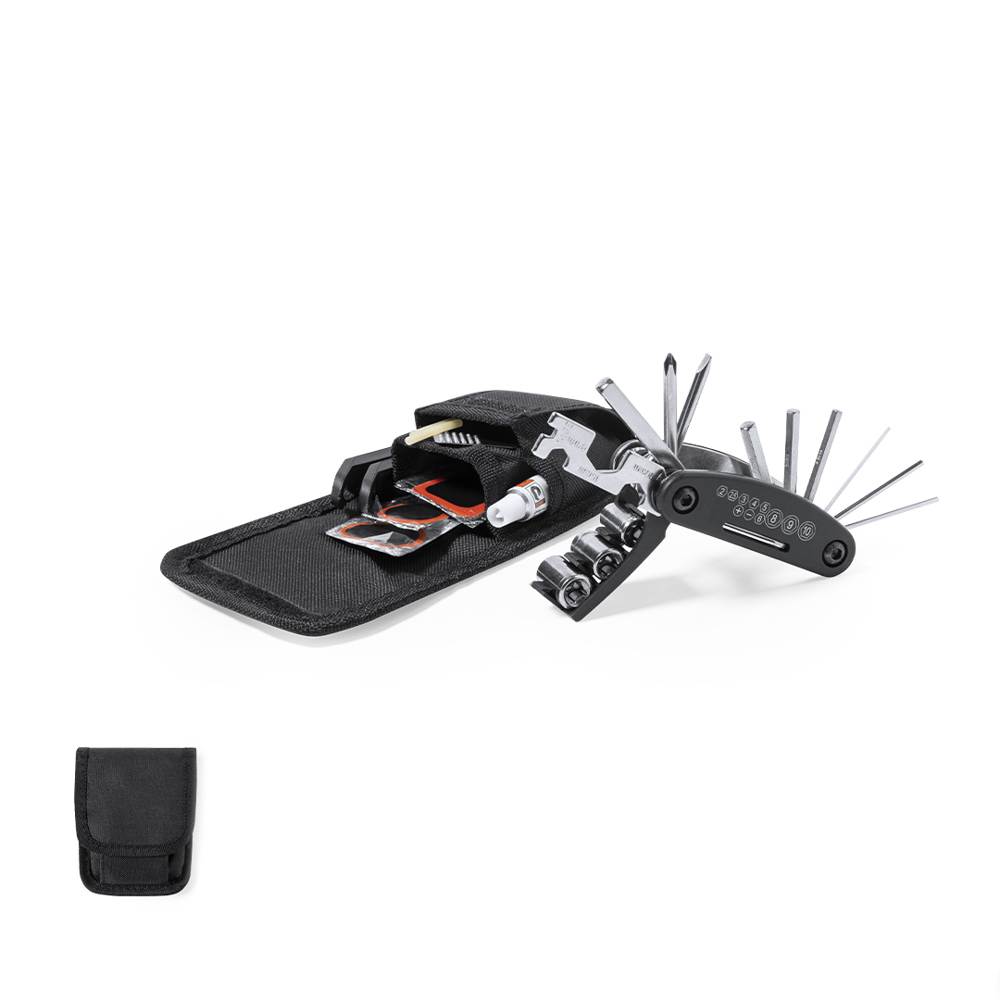 Komplettes Fahrradreparaturset mit 14 Zubehörteilen. Verpackt in einer strapazierfähigen 600D-Polyestertasche mit Klettverschluss. Inklusive Reifenmontiergerät, Multi-Tool und Pannenhilfe.