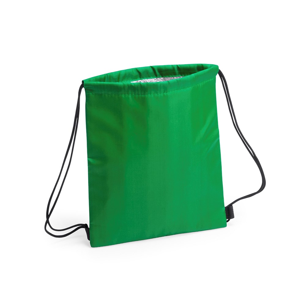 Kühlrucksack mit Kordelzug für Kinder aus weichem 210D-Polyester, in fröhlichen Farben und in einer breiten Farbpalette. Mit schwarzen selbstschließenden Seilen und verstärkten Ecken. Isotherme Innenseite in Aluminiumausführung.