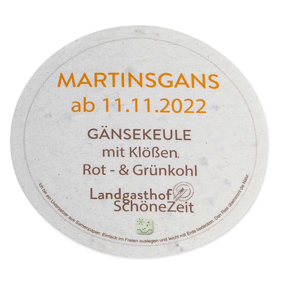 Bierdeckel haben als Werbefläche Tradition. Oftmals werden auf den Untersetzern humorvolle Slogans aufgedruckt und beim kühlen Bier oder einer Limonade in entspannter Atmosphäre wird die Werbung optimal wahrgenommen. Mögliche Samensorten: Blumenmischung, Kräutermischung, Mohnblume, Thymian.