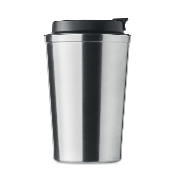 Doppelwandiger Becher aus Edelstahl mit PP-Deckel. Füllmenge: 350 ml.