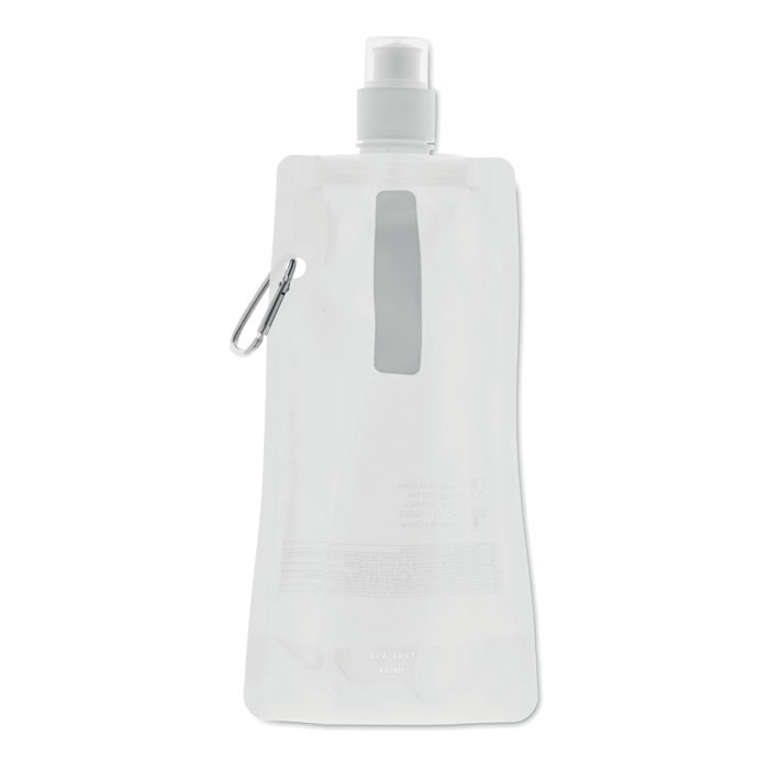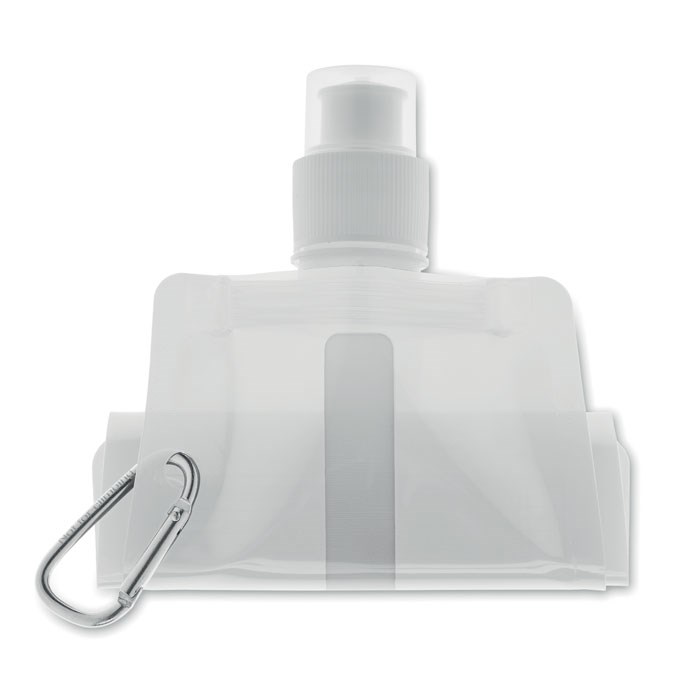 Faltbare Wasserflasche aus BPA freiem PET mit Alu-Karabiner. Füllmenge: 480 ml.