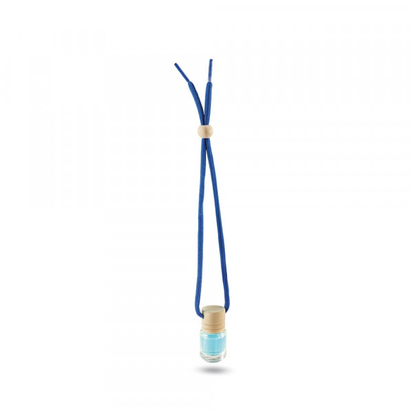 Auto-Lufterfrischer mit Oceanduft in 5 ml Glas mit Holzdeckel und farblich passender Kordel zum Aufhängen mit Kordelstopper aus Holz. Präsentiert in einer individuellen PVC-Box.