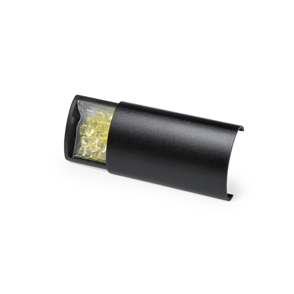 Armaturenbrett-Lufterfrischer in elegantem Design. Mit Schiebefront aus Aluminiumgranulat und einer widerstandsfähigen Rückseitenhalterung für den Grill. Parfümkugeln mit Zitronenduft und in den Farben Silber und Schwarz erhältlich.