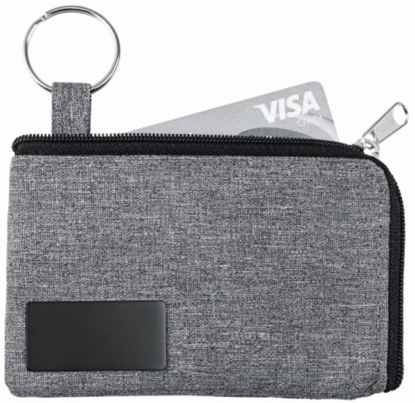 Innovative Schlüsseltasche mit mattschwarzer Metallplakette und großer Öffnung. Umlaufender Reißverschluss, VPE 200, Recycling Anteil 10%, Kartenfach, 30mm Schlüsselring