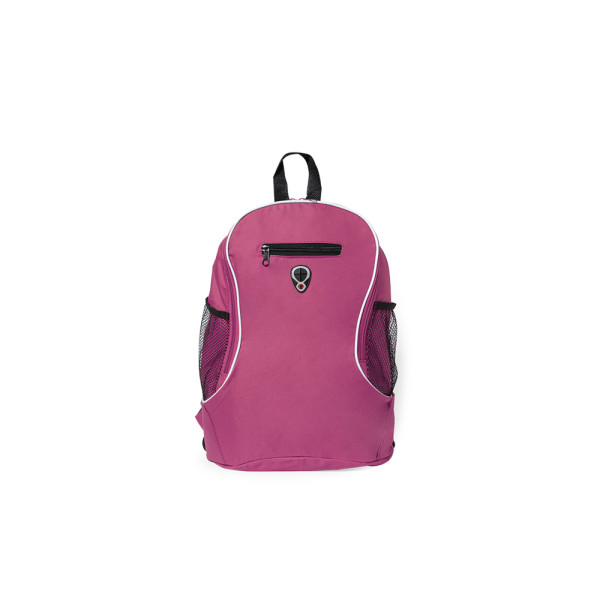 Rucksack aus 600D-Polyester. Hergestellt in fröhlichen und abwechslungsreichen Farben mit breiter Öffnung der Haupttasche und praktischer Tasche im mittleren Teil. Er hat zwei elastische Netztaschen an den Seiten und einen originellen Kopfhörerausgang an der Vorderseite. Schwarzes Zubehör mit bequemen, gepolsterten und verstellbaren Schultergurten.