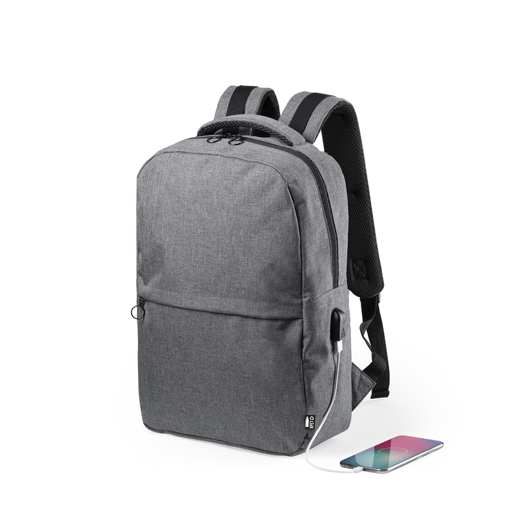 Business-Rucksack aus widerstandsfähigem 600D RPET-Material, das aus recycelten Kunststoffmaterialien hergestellt wird, um die Wiederverwendung von Kunststoffresten zu fördern und zur Nachhaltigkeit der Erde beizutragen. Mit Doppelreißverschlusstasche und Vordertasche. Innenfach mit gepolsterten Fächern für Tablets bis zu einer Größe von 10 Zoll und Laptop bis zu 15 Zoll, einschließlich USB-Anschluss zum laden mobiler Geräte (Kabel im Lieferumfang enthalten, Zusatzakku nicht enthalten). Verstärkte Ecken und Zubehör in schwarzer Farbe. Mit gepolstertem Rücken und verstellbaren, gepolsterten Schultergurten. RPET Etikett.