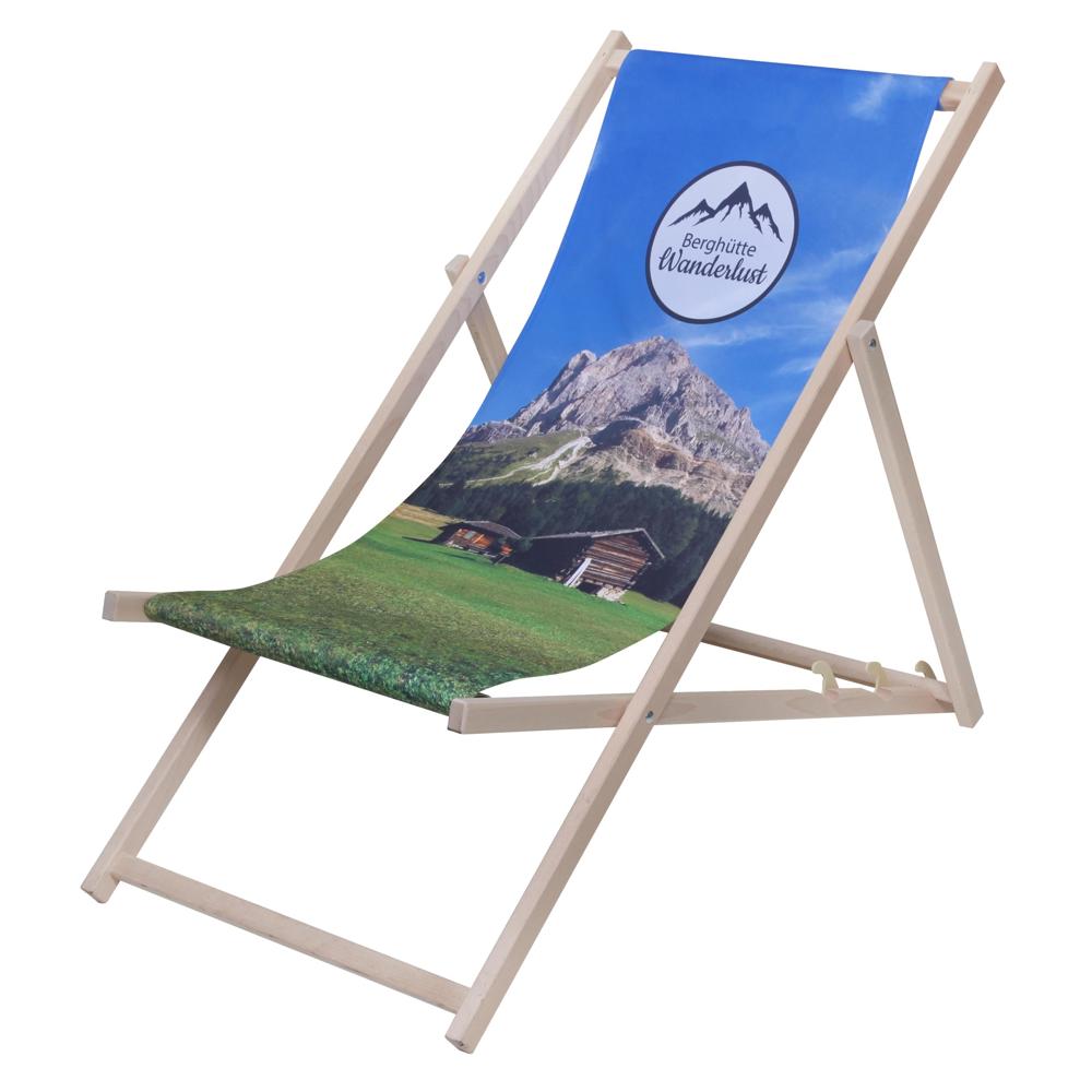 Egal ob Strand, Balkon oder Garten - Hauptsache chillen. Verstellbarer Liegestuhl aus Buchenholz mit Polyester-Bezug, der individuell bedruckt werden kann. Der Bezug ist abnehm- und waschbar. Tragfähigkeit: 95 kg.