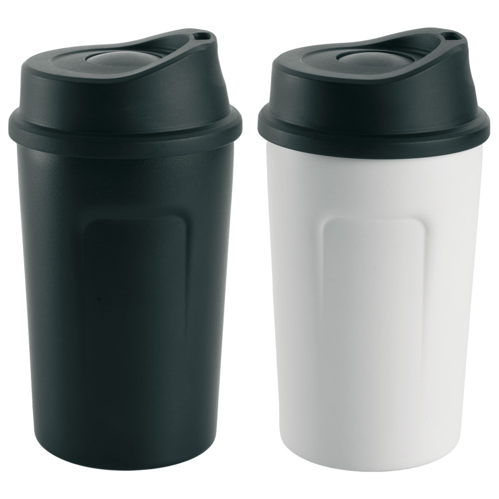 Thermobecher aus Edelstahl in den Farben schwarz und weiß. Der Becher hat ein Volumen von 360 ml. Mit dem praktischen Druckknopf lässt sich die Öffnung schnell verschließen und wieder öffnen.