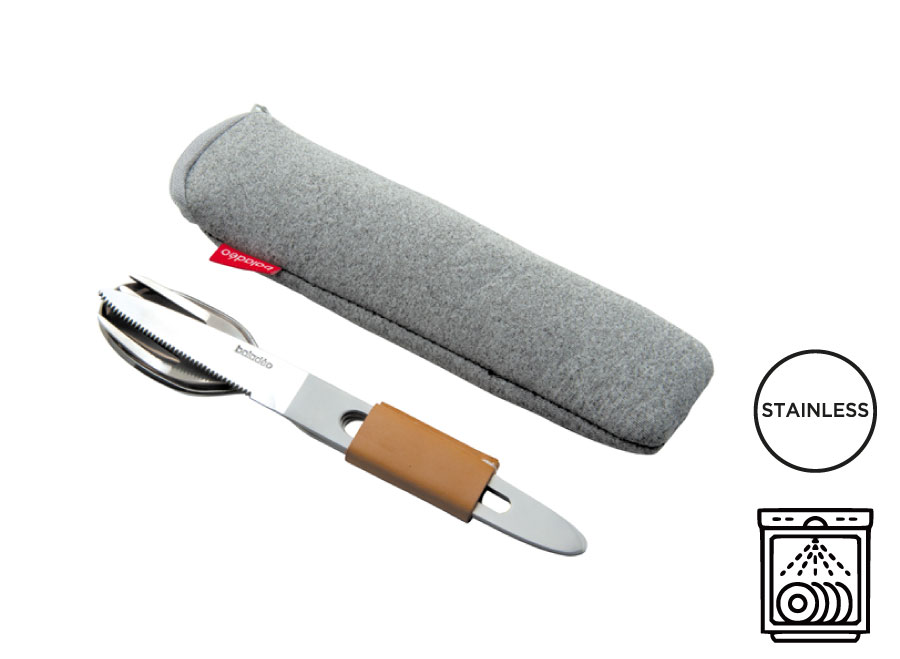 Besteckset aus 420er Edelstahl für den Lebensmittelgebrauch. 3 Funktionen: Messer mit Mikrozahnung, Gabel, Löffel. Spülmaschinenfestigkeit. Manschette aus Kunstleder. Wird in einem Neoprenetui geliefert.