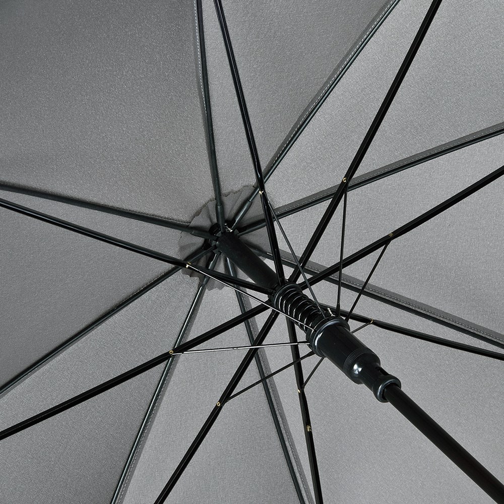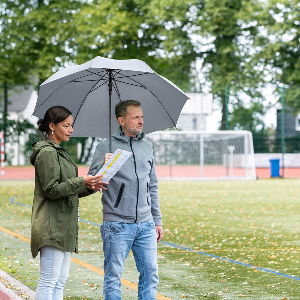 Komfortabler Automatik-Gästeschirm für zwei Personen mit handsympathischem Softgriff Komfortable Automatik-Funktion zum schnellen Öffnen, höhere Gestell-Flexibilität und bessere Windsicherheit durch Windproof-System, flexible Fiberglasschienen, gerader Softgriff, höherer Korrosionsschutz durch schwarze Galvanisierung des Stahlstocks, gastfreundlicher großer Durchmesser