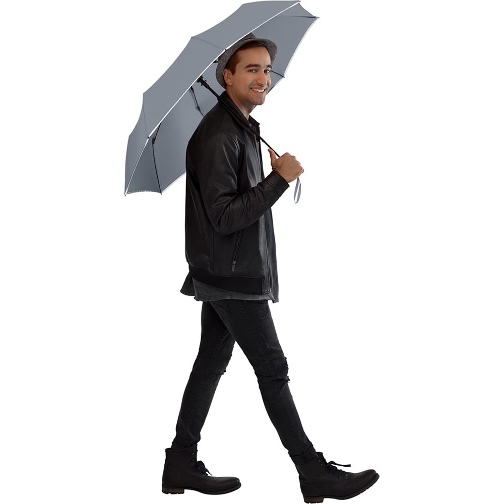 Stabiler Automatik-Taschenschirm mit modisch reflektierender Paspelierung Komfortable Automatik-Funktion zum schnellen Öffnen, hochwertiges Windproof-PLUS-System für eine maximale Gestell-Flexibilität bei stärkeren Windböen, Bezug mit modischer Reflexpaspel in silber, Soft-Touch-Griff mit glänzender Auslösetaste und Werbeanbringungsmöglichkeit, Futteral mit modischer Reflexpaspel