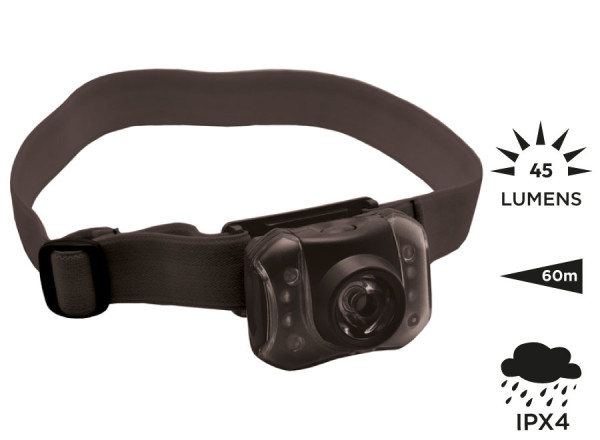 3 Beleuchtungsmodi: Weiße LED (100% oder 50%) und rotes LED. Verstellbarer Lichtstrahl. Gehäuse aus ABS-Kunststoff. Bequemes elastisches Stirnband. Funktioniert mit 3 AAA-Batterien (im Lieferumfang enthalten). Maximale Leistung der LED: 1W (45 Lumens). Strahlweite: 60m. Wasserbeständigkeitsniveau: IPX-4.