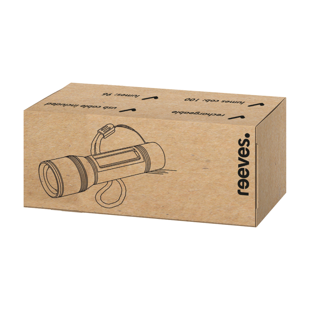 Die wiederaufladbare Taschenlampe aus Aluminium ist silbern oder schwarz eloxiert verfügbar. Sie verfügt über eine LED-Leuchte mit Lichtkegel-Zoom und einer seitlichen COB-Leuchte. In Höhe des Kopfes der Taschenlampe befindet sich ein schwarzes Griffband.