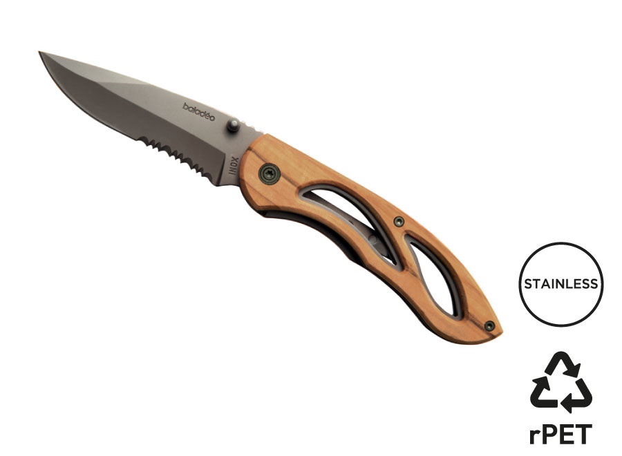 Klappbares Messer mit Klinge aus 420er Edelstahl und Titanbeschichtung. Montage mit Torx-Schrauben. Griff aus Olivenholz. Einhändiges Öffnen/ Schließen mit einem Liner-Lock Sicherheitsmechanismus. Gürtelclip. Wird in einem melierten grauen Etui aus RPET geliefert.