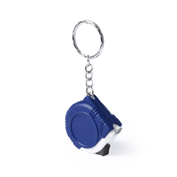 Schlüsselanhänger mit 1 m langem Metallmaßband mit Verriegelungsmechanismus. Maßangabe in Zentimeter, Zoll und Fuß. Mit spezieller Stanzung zum Bedrucken.