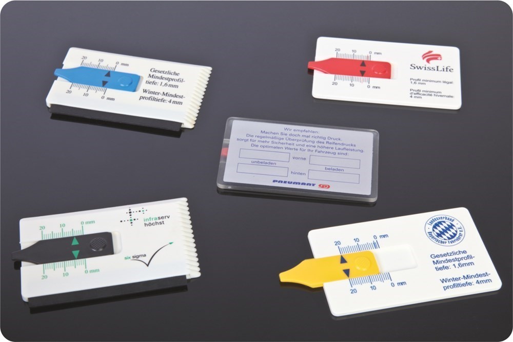 Reifenprofilprüfer im Scheckkartenformat mit Angabe der gesetzlichen Mindest-Profiltiefe und Winter-Mindestprofiltiefe. Der Werbedruck auf der Vorderseite erfolgt ohne Aufpreis, sofern er in der Skalierungsfarbe erfolgt! (Nur Druckvorkosten)1-farbige SkalaMade in Germany