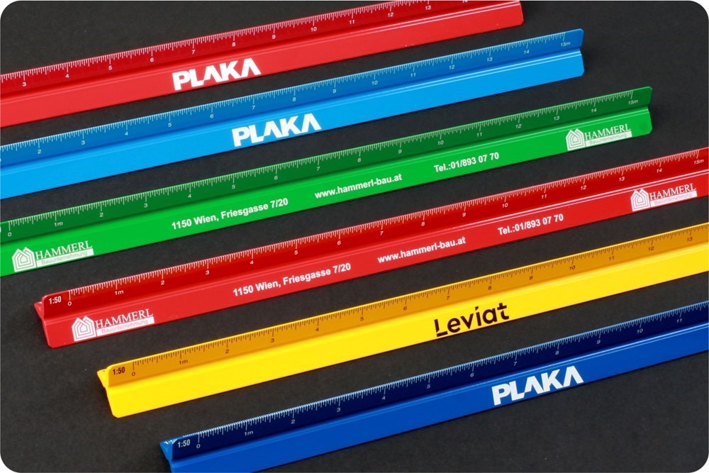 Die Bestseller Aluminium-Dreikantlineale in 15cm + 20cm + 30cm sind jetzt auch in farbiger Ausführung lieferbar.Alle verfügbaren RAL-Farben können ab einer Menge von 500 Stück in matt oder glänzend bestellt werden.Alle Modelle besitzen eine Spitzenqualität und werden auftragsbezogen individuell gefertigt.5 Wunschskalierungen sind gemäß nebenstehender Tabelle auswählbar.Der Werbedruck erfolgt in Pantone Farbe auf der 6. Seite (Freileiste).Garantie* 5 Jahre.
