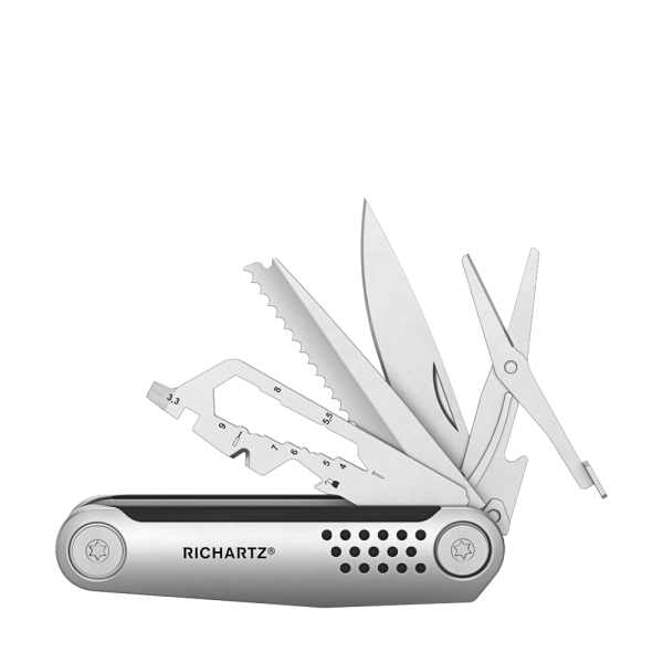 Das Taschenmesser, neu gedacht - und mit 15 Funktionen für alle Lebenslagen ausgestattet: darunter Klinge, Säge, Kapselheber, Schere, Schlitzschraubendreher, Fahrradspeichenschlüssel, Sechskantschlüssel (5), Vielzahnschlüssel (2), Kabelabzieher, Nagelzieher. Der Clou: Alle Funktionen sind auf einer Seite angebracht und können arretiert werden. So lässt es sich besser und sicherer arbeiten als mit klassischen Ausgaben des Taschenmessers. Noch Fragen?