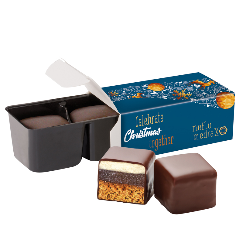 Lambertz Dominosteine im 2er Blister in Werbebox aus weißem Karton, individuell bedruckt. Inhalt: 2 Lambertz Dominosteine (dreischichtig) bezogen mit edler Zartbitterschokolade., 25 g